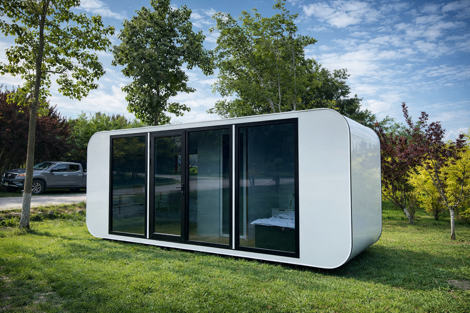 Roulotte dal design unico, rivisitata con materiali innovativi e ampie vetrate. Spostabile, personalizzabile e confortevole.